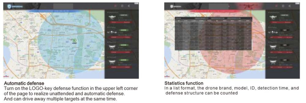 Tööliides: kaardil kuvatakse sihtkaitseala lõppseadmete olukord. Süsteem annab kohe häireid pärast drooni avastamist ning kaardil kuvatakse lennu kaubamärk, mudel, asukoht, lennu trajektoor ja praegune olemus: "must õhusõiduk" või valges nimekirjas olev õhusõiduk"